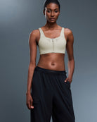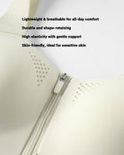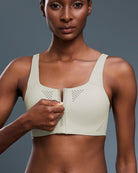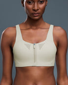 Meet your new go-to for breathable comfort and a personalized fit. Seamless construction and molded one-piece cups contour smoothly to your shape, while all-over perforations help release heat. A front-zip closure makes changes quick and easy, and the soft, skin-friendly fabric (78% nylon / 22% spandex) feels lightweight yet resilient.